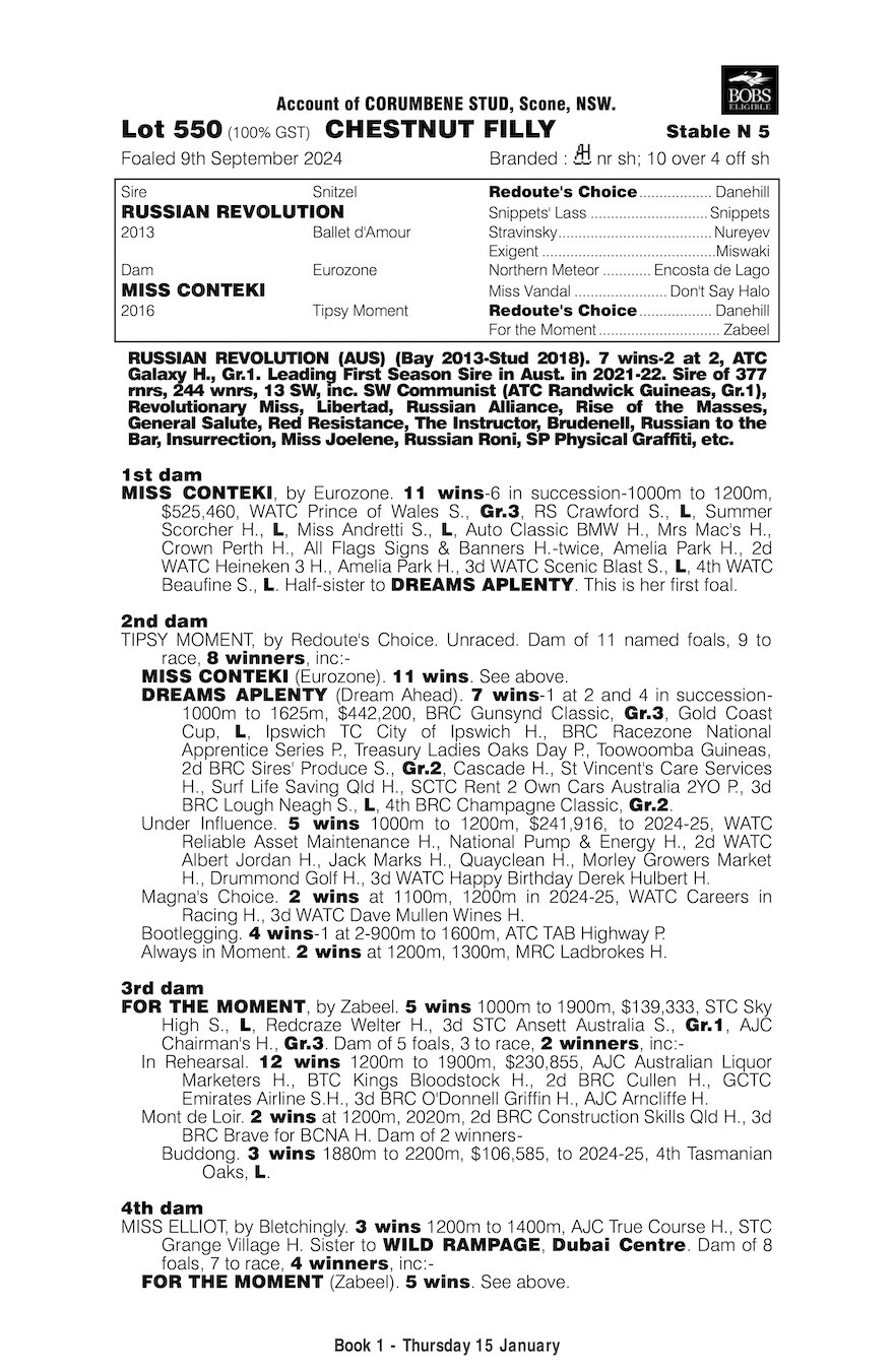 Un-named (Russian Revolution – Miss Conteki) 1 Year Old Chestnut Filly ProfilePedigreeEnquire Sire: Russian Revolution Colour: Chestnut Dam: Miss Conteki Sex: Filly Age: 1 Foaled: Sep 09, 2024 Country: Australia Silks: First Name (required) Last Name (required) Your Email (required) Phone Message Hello, I'd like to know more regarding the horse Un-named (Russian Revolution - Miss Conteki) you have listed as available. Send Δ